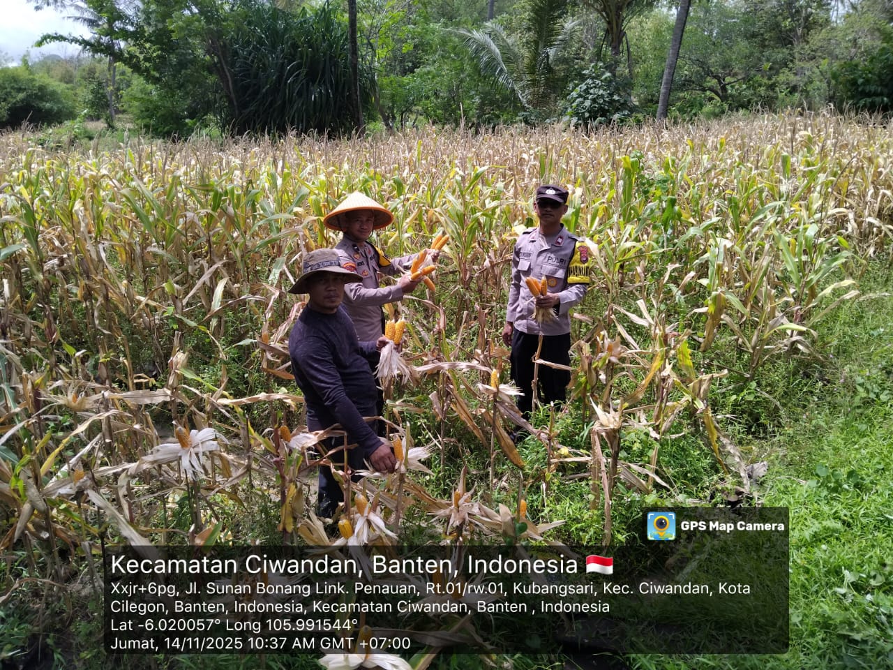 Cilegon - Polsek Ciwandan Polres Cilegon Polda Banten mendukung kegiatan panen jagung Hibrida hasil penanaman Kelompok Tani Kubang Lestari I di Kelurahan Kubangsari Kecamatan Ciwandan, Kota Cilegon, Jum’at (14/11/2025).
