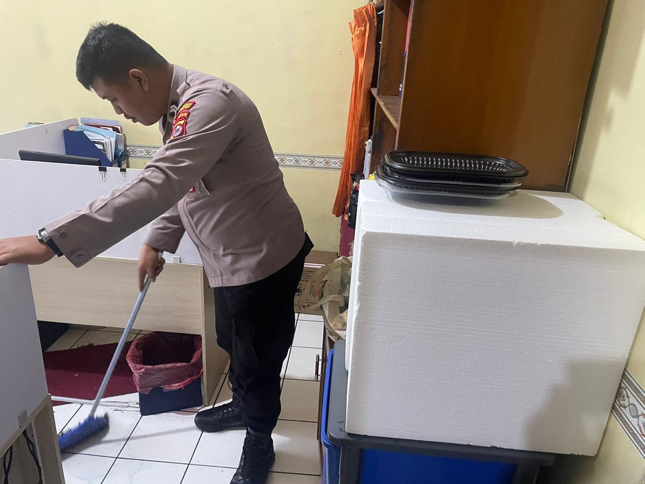 Anggota Bag SDM Polres Cilegon, aktivitas rutin selalu melakukan kegiatan memberrsihkan ruangan kerja.