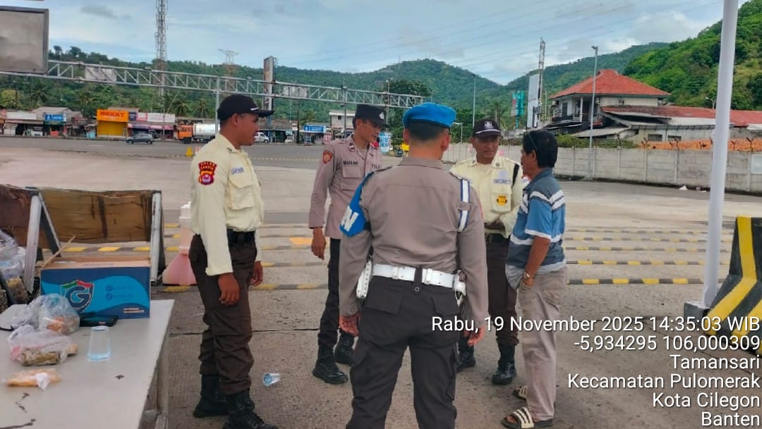 Cilegon - Personel Polsek Kskp Merak Polres Cilegon Polda Banten melaksanakan sambang dan patroli kawasan pelabuhan merak dalam rangka menjaga Harkamtibmas di Kawasan Pelabuhan Merak, Rabu (19/11/2025).