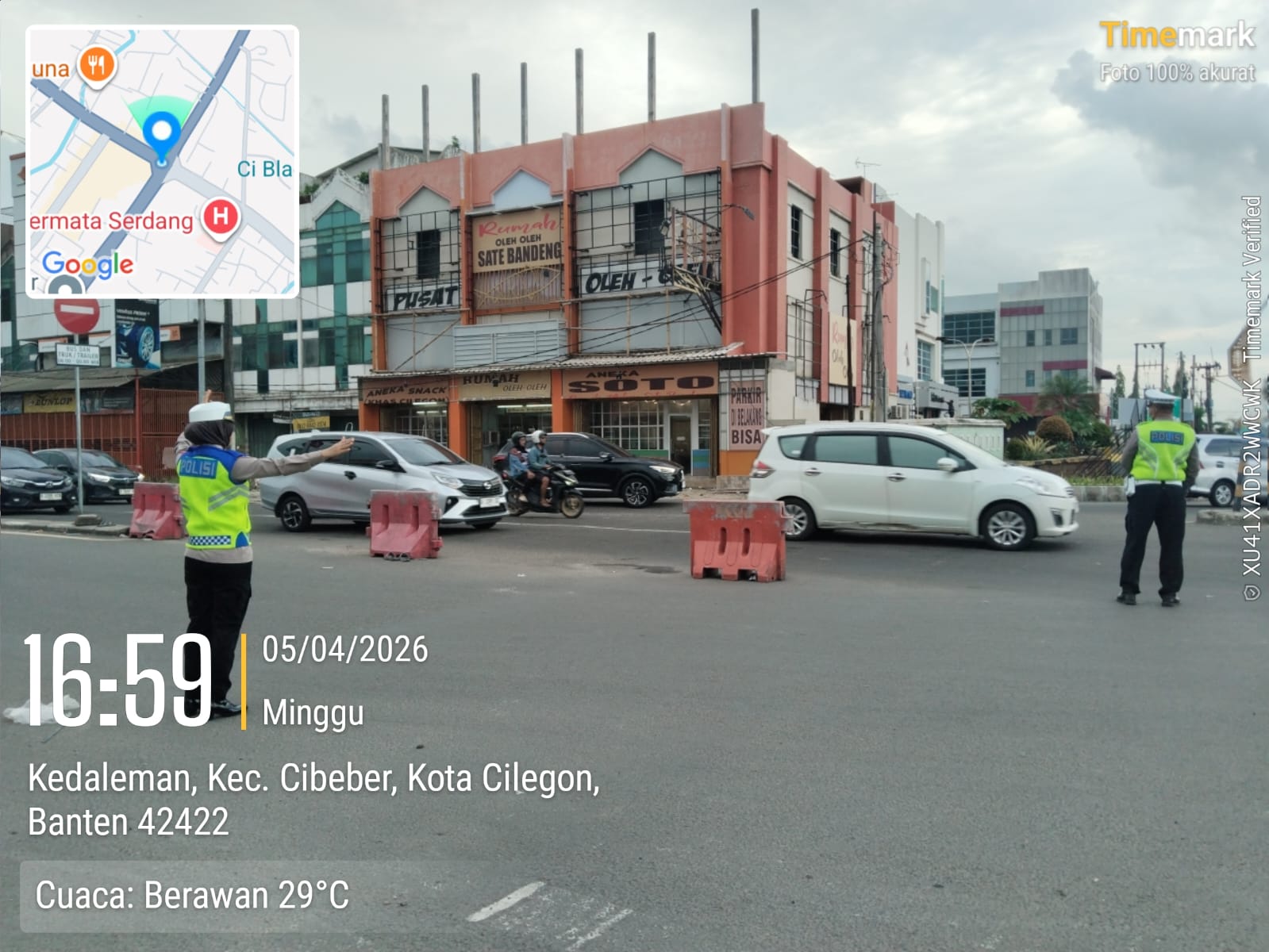 Cilegon – Polres Cilegon Polda Banten, Dalam Mewujudkan Aksi Nyata Pelayanan Kepada Masyarakat, Personil Satlantas Polres Cilegon Polda Banten Laksanakan PECAK (Pergelaran Cepat Anggota Kepolisian) Pengaturan Lalu lintas di wilayah perkotaaan terutama di titik rawan kemacetan dan kecelakaan lalu lintas, Minggu (05/04/2026).