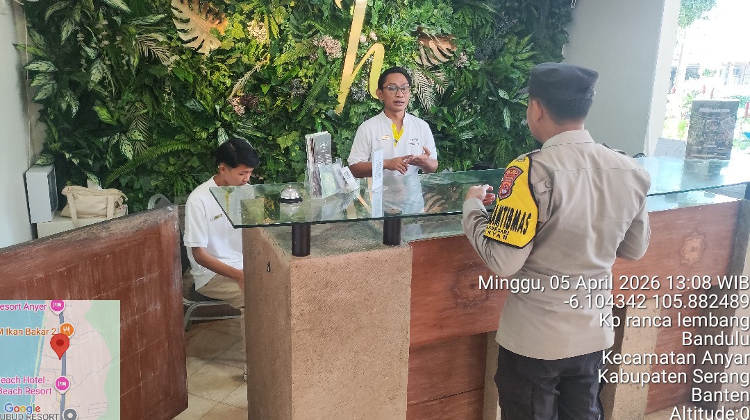 Cilegon – Polres Cilegon Polda Banten, Personel Polsek Anyer Polres Cilegon melaksanakan sambang dan patroli kawasan wisata Pantai dan hotel dalam rangka menjaga Harkamtibmas di Kawasan Wisata Darkum Polsek Anyer Polres Cilegon pada saat weekend, Minggu (05/04/2026).