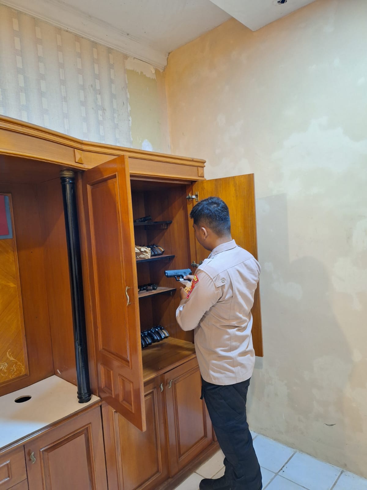 STAFF LOGISTIK MEMBERSIHKAN SENJATA API DI GUDANG POLRES CILEGON