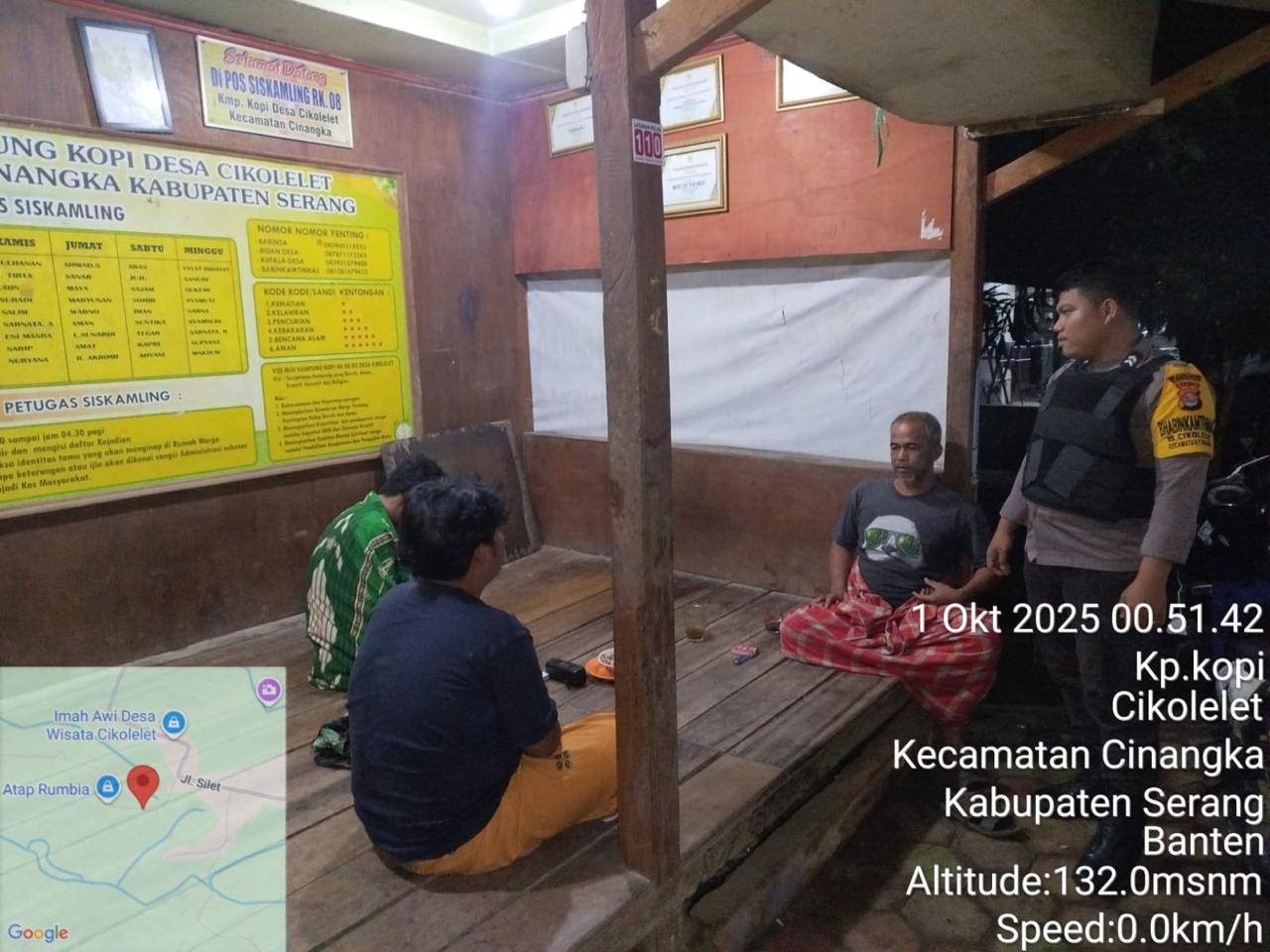 *Polres Cilegon* || Personil Bhabinkamtibmas Polsek Cinangka melaksanakan Program Komandan Wish Kapolda Banten RONDA SATKAMLING menyampaikan komunikasi dengan Petugas Siskamling agar berperan aktif dalam menciptakan Harkamtibmas yang aman dan Kondusif, Rabu (01/10/2025).