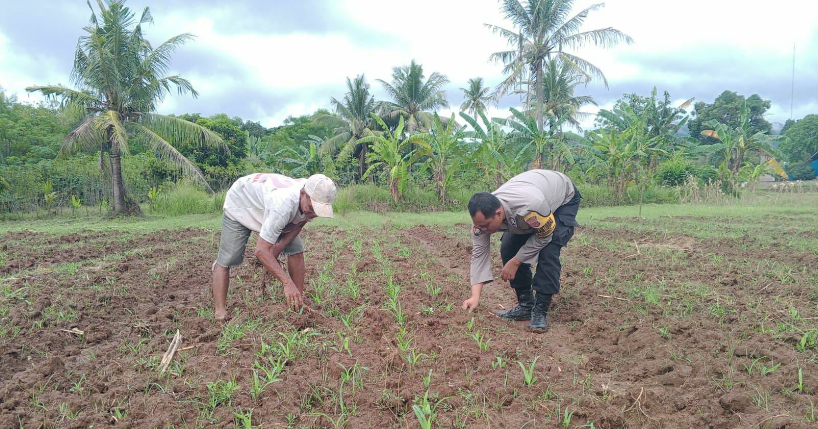 Cek Pertumbuhan Jagung Di Ladang Petani, Bripka Bambang dan Bripka Susilo Bhabinkamtibmas Sambangi Petani