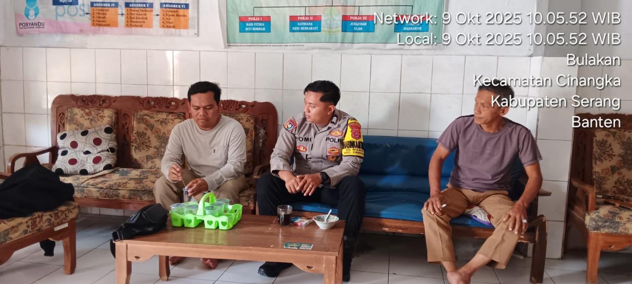 *CILEGON* dalam Rangka Mengantisipasi Gktm di wilayah Personil Bhabinkamtibmas Cinangka melakukan patroli Dialogis dengan Kepala Desa dan warga dan Menanyakan situasi Kamtibmas di wilayah dalam Rangka Menjaga Harkamtibmas di Desa Binaannya Kecamatan Cinangka Kab. Serang. Kamis (09/10/2025).