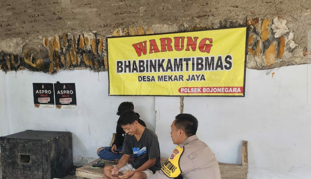 Brigadir Andri bersama Brigadir Bagus Wibi Bhabinkamtibmas Polsek Bojonegara Berbincang Bincang dengan masyarakat Di Warung Bhabin Edukasi Kamtibmas Dan Sosialisasi Call Center 110