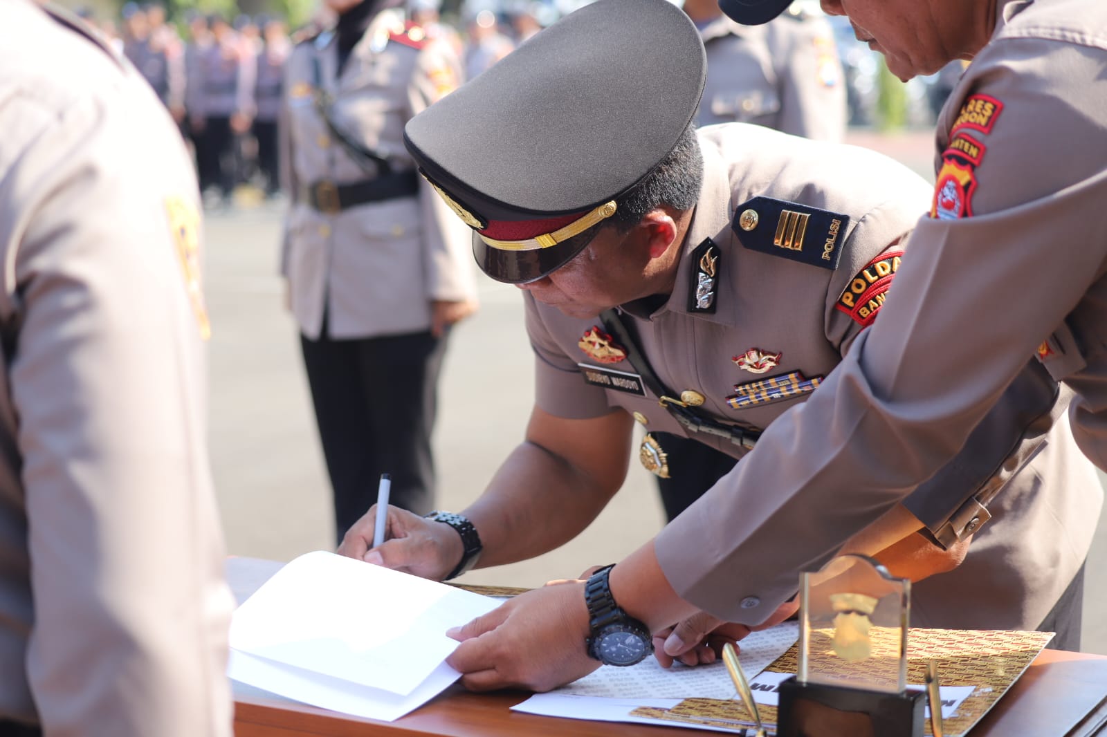 Rangkaian kegiatan sertijab diawali dengan pengambilan sumpah jabatan, disaksikan oleh para Pejabat Utama dan personel Polres Cilegon, kemudian dilanjutkan dengan penandatanganan fakta integritas sebagai bentuk komitmen moral dan profesionalisme pejabat baru dalam melaksanakan tugas.