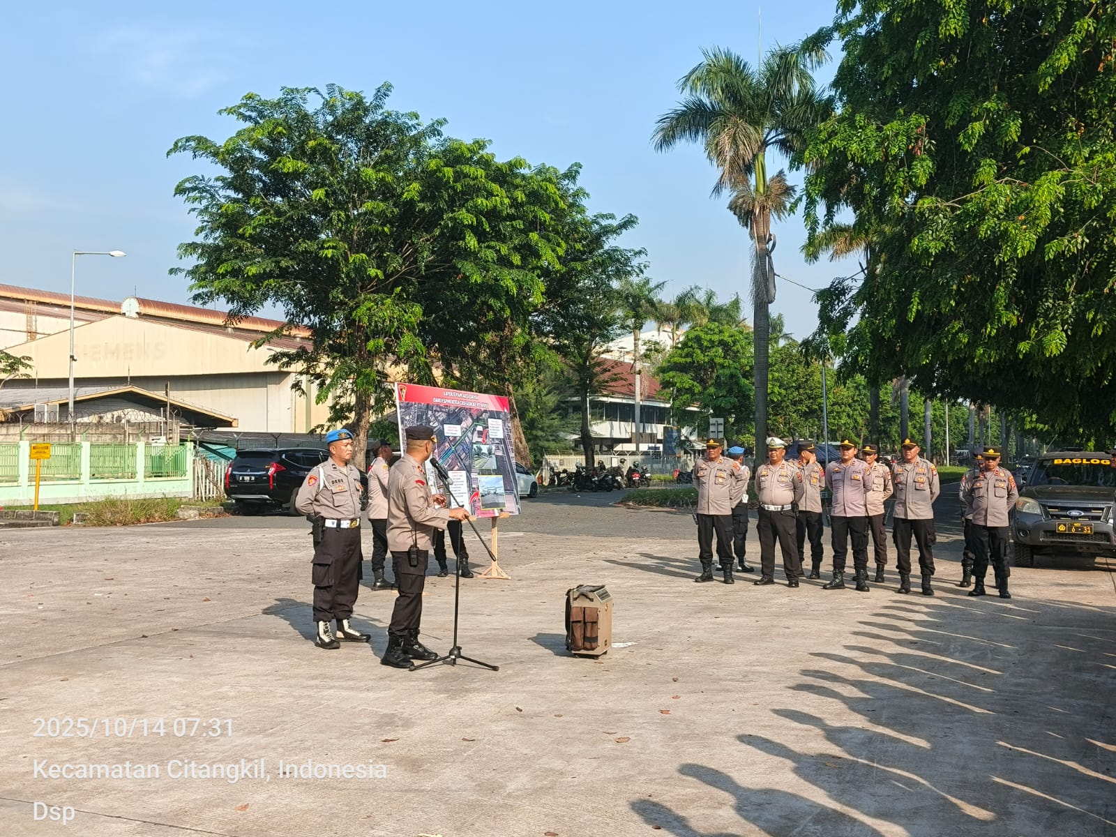 Cilegon -  Kapolsek Ciwandan KOMPOL Andi Suherman Pimpin Apel pengamanan aksi damai dari Serikat Pekerja FSPMI Kota Cilegon ke PT. KNSS Cilegon pada Selasa, (14/10/2025).