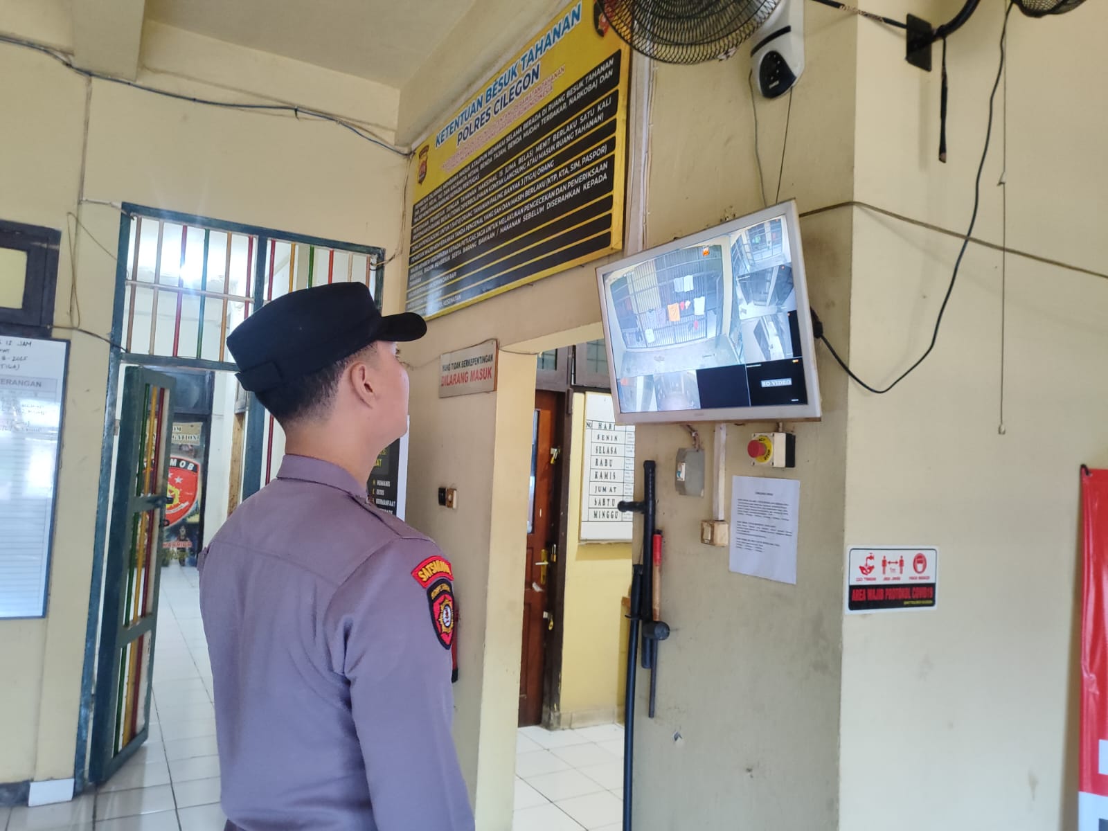 Personil Sat Tahti Cek Tahanan melalui CCTV yang ada di Rutan Polres Cilegon.