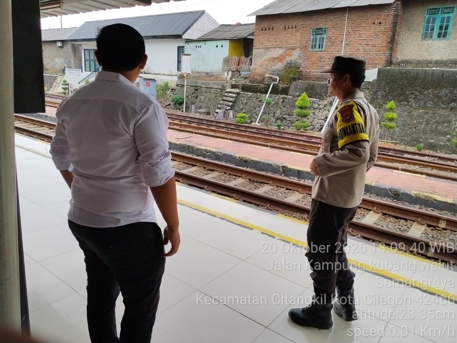 Cilegon - Personil Polsek Ciwandan Polres Cilegon Polda Banten melaksanakan giat patroli Dan dengan sambangi Petugas Stasiun Kereta Api dan penjaga pintu perlintasan kereta api, Senin (20/10/2025).