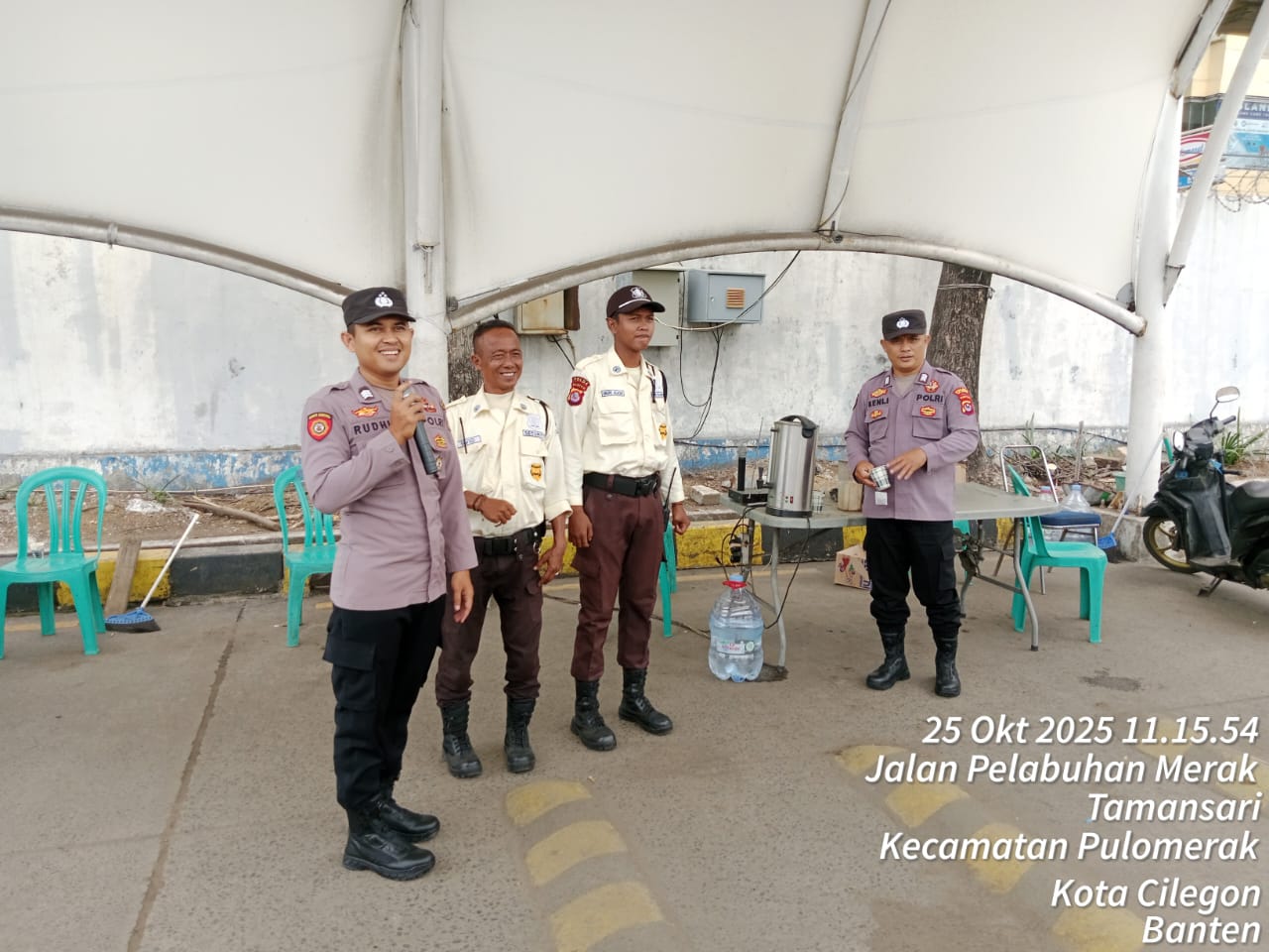 Cilegon - Personel Polsek Kskp Merak Polres Cilegon Polda Banten melaksanakan sambang dan patroli kawasan pelabuhan merak dalam rangka menjaga Harkamtibmas di Kawasan Pelabuhan Merak, Sabtu (25/10/2025).