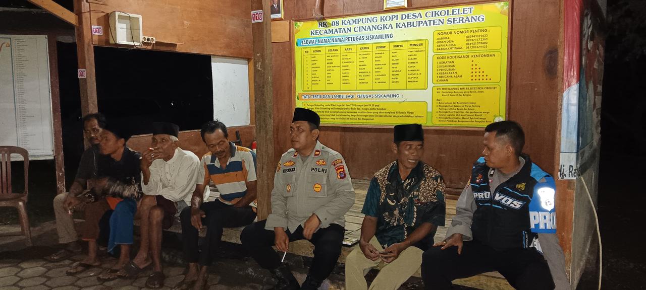*Polres Cilegon* Kapolsek Cinangka melaksanakan Program Commander Wish Kapolda Banten RONDA SATKAMLING menyampaikan komunikasi dengan Petugas Siskamling agar berperan aktif dalam menciptakan Harkamtibmas yang aman dan Kondusif, Minggu (26/10/2025).