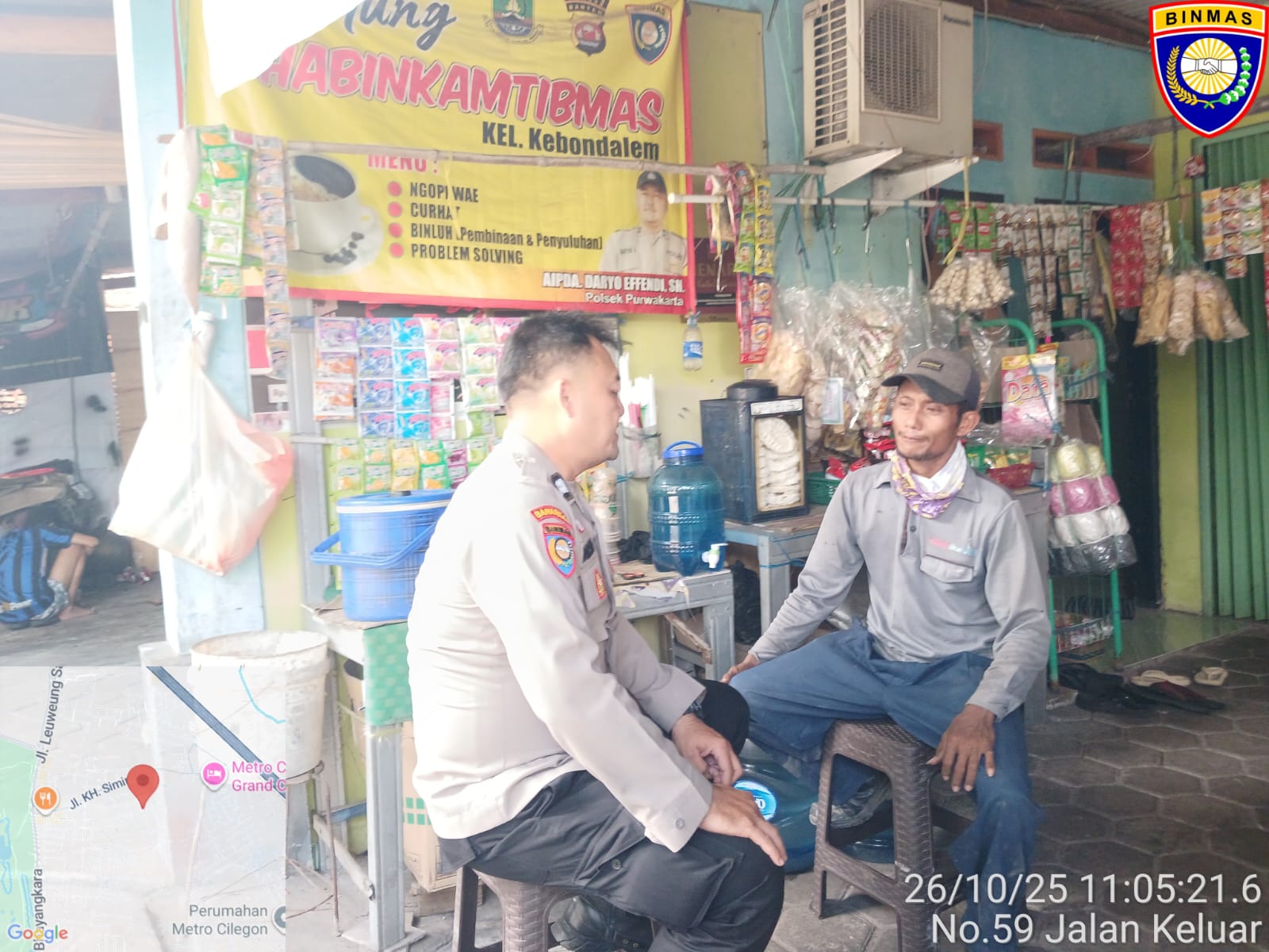 -POLRES CILEGON–Polda Banten. Babinkamtibmas Kelurahan Kebondalem, Aiptu Daryo Efendi, melaksanakan kegiatan dialog bersama warga di salah satu warung kopi Bhabinkamtibmas di lingkungan Kelurahan Kebondalem, Kecamatan Purwakarta, Kota Cilegon. Kegiatan ini merupakan bagian dari upaya menjalin kedekatan dan komunikasi yang baik antara kepolisian dengan masyarakat.