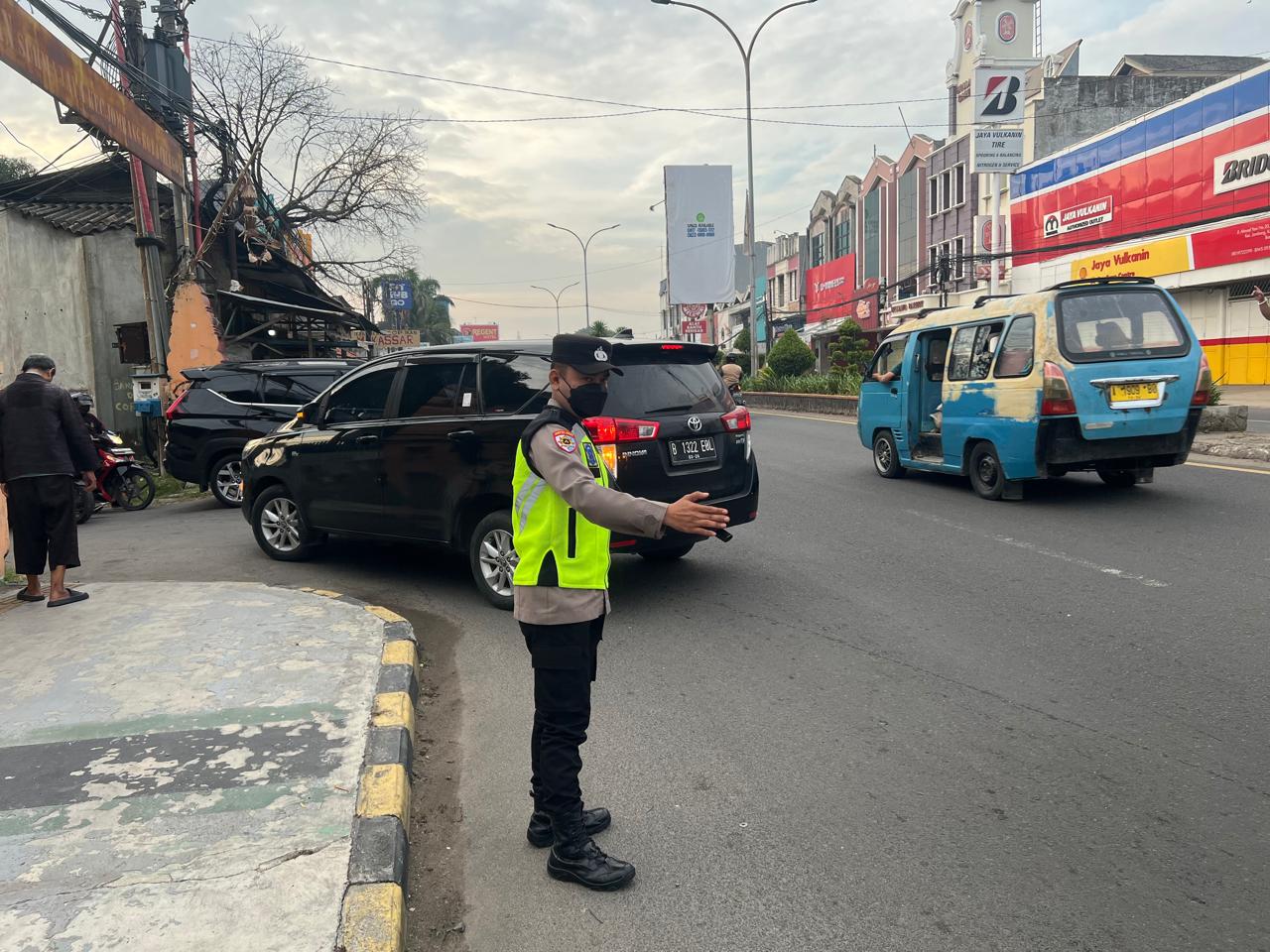 Cilegon,Polres Cilegon Polda Banten Pada Kamis/30/10/2025 Pukul 06.30 Wib, Personil Siwas Polres Cilegon, Aipda Emi Prasetyo melaksanakan kegiatan pengaturan arus lalu lintas di Jalur Protokol jalan utama Kota Cilegon tepat nya di jalur depan perumahan arga baja Pura Kota Cilegon.