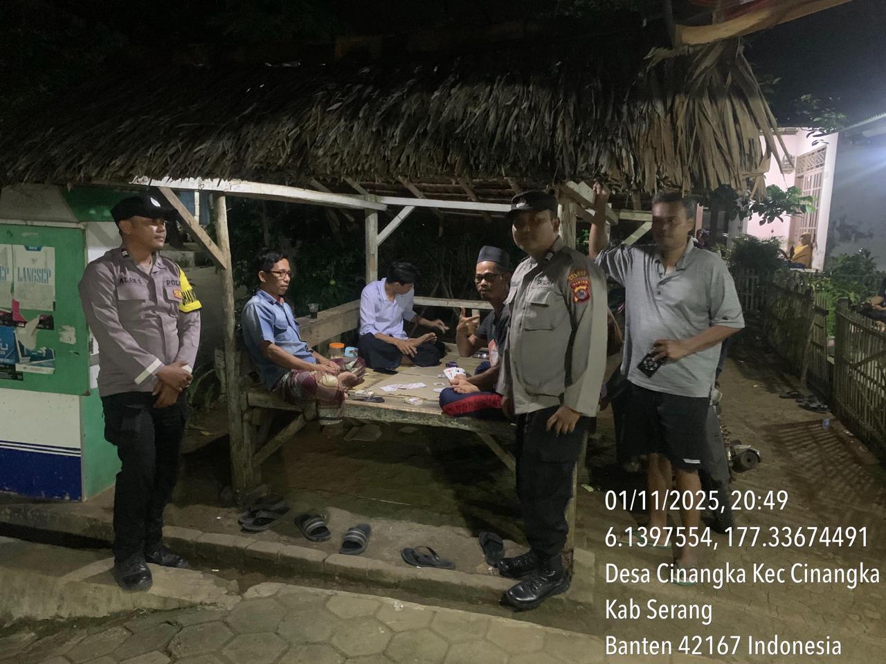 *Polres Cilegon* || Personel Bhabinkamtibmas Polsek Cinangka melaksanakan Program Komandan Wish Kapolda Banten RONDA SATKAMLING menyampaikan komunikasi dengan Petugas Siskamling agar berperan aktif dalam menciptakan Harkamtibmas yang aman dan Kondusif, Minggu (02/11/2025).