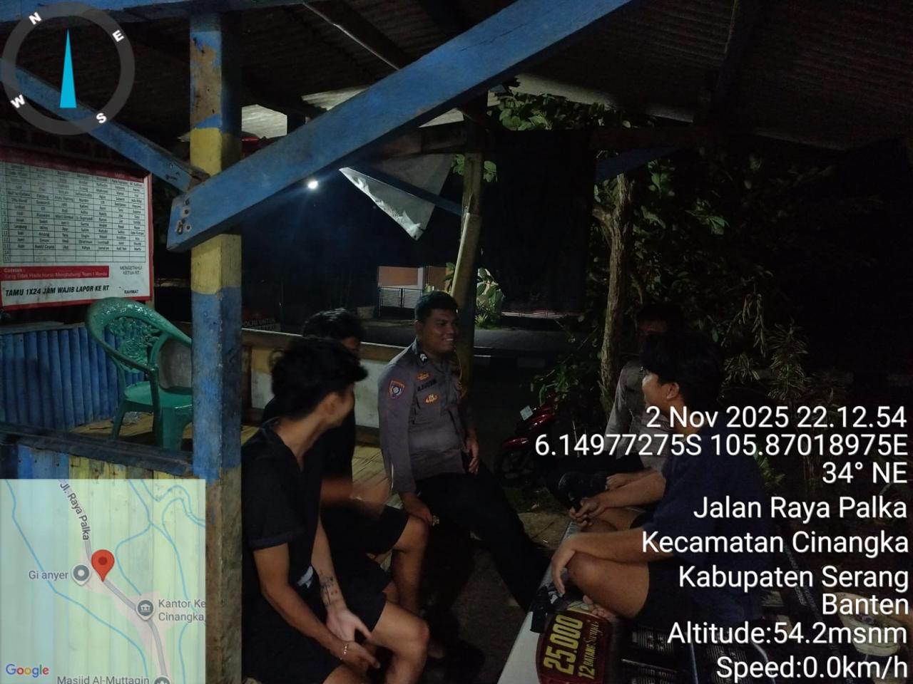 *Polres Cilegon* || Personel Bhabinkamtibmas Polsek Cinangka melaksanakan Program Komandan Wish Kapolda Banten RONDA SATKAMLING menyampaikan komunikasi dengan Petugas Siskamling agar berperan aktif dalam menciptakan Harkamtibmas yang aman dan Kondusif, Senin (03/11/2025).