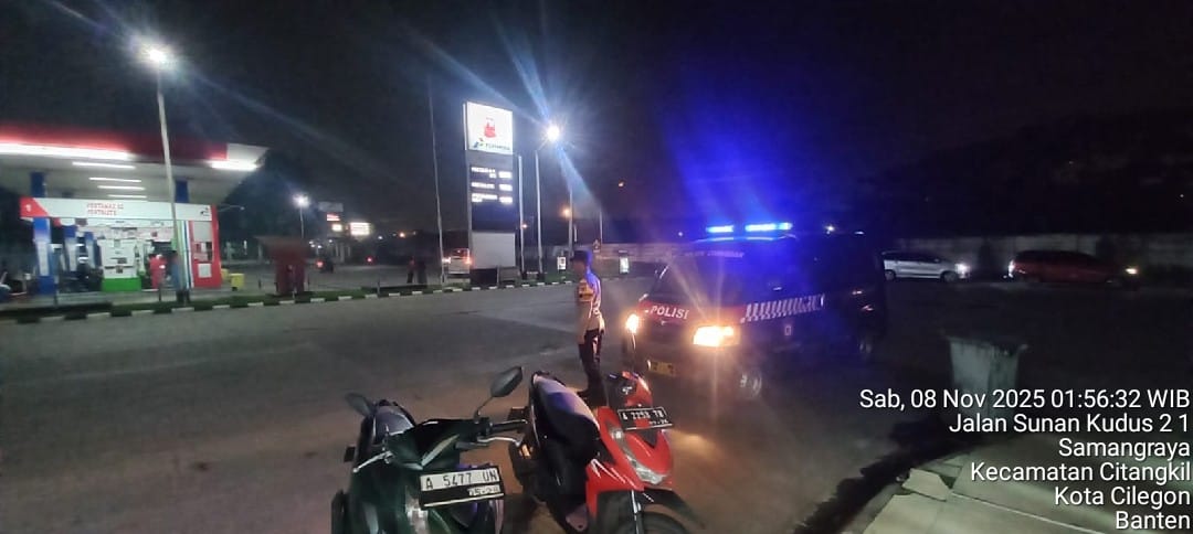 Cilegon - Personil Polsek Ciwandan Polres Cilegon Polda Banten Dalam Pelaksanaan Kegiatan Patroli dengan menyalakan lampu rotator berwarna biru di Daerah Hukum Polsek Ciwandan Polres Cilegon Polda Banten dari malam hingga dini hari, dalam rangka menciptakan situasi aman dan kondusif, Sabtu (08/11/2025).