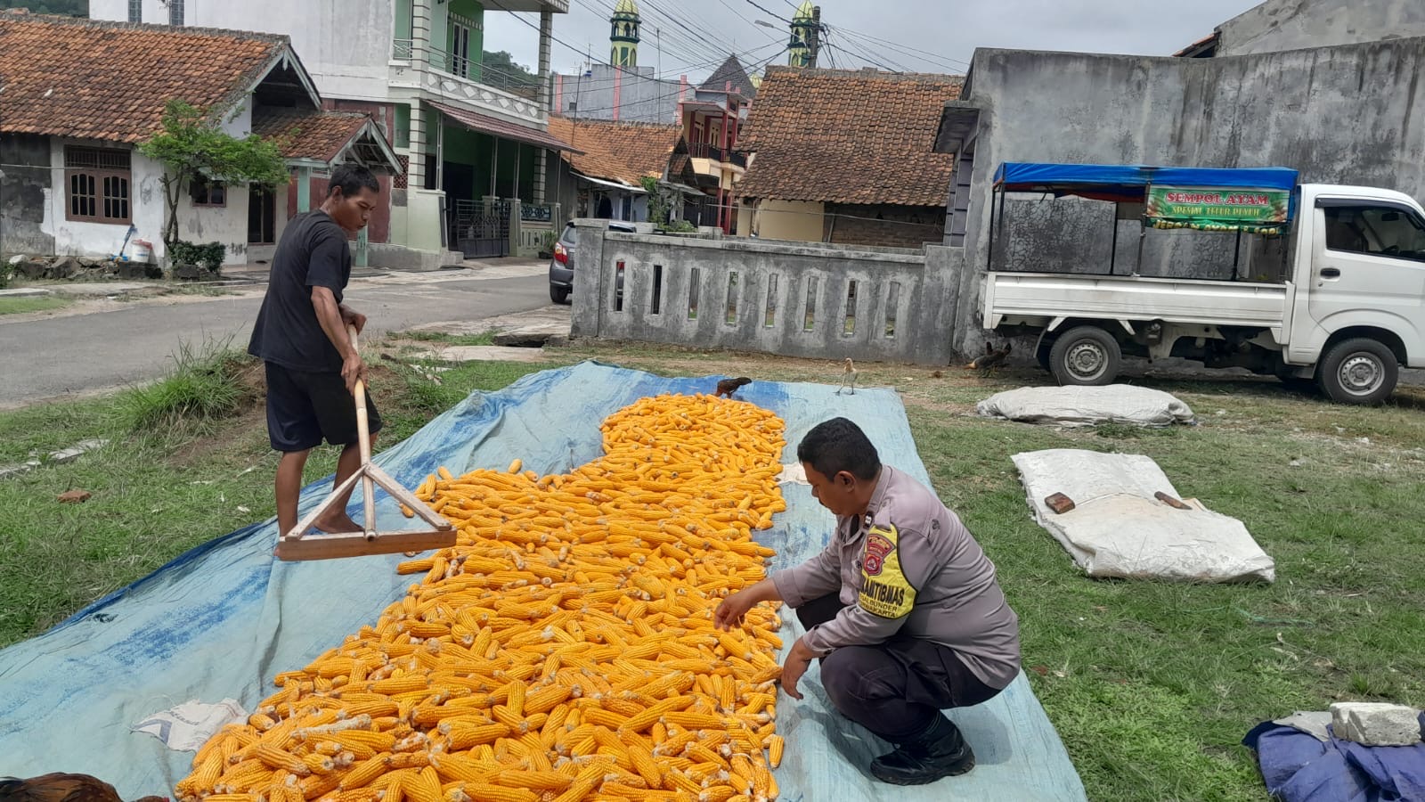 Selain membantu menjemur jagung, Aiptu Wawan Setia Budi juga memberikan imbauan kamtibmas kepada para petani. Ia mengingatkan agar selalu waspada terhadap potensi tindak kriminalitas, seperti pencurian hasil panen.