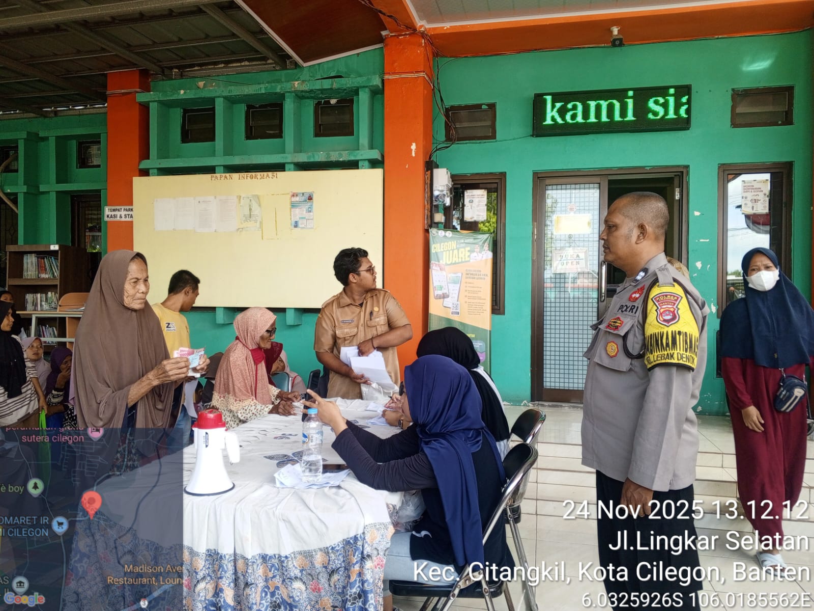 Cilegon - Bhabinkamtibmas Kelurahan Lebak Denok, AIPTU YUDI SETIAWAN, melaksanakan pengamanan dan monitoring bantuan langsung tunai dari Kementerian Sosial RI di Kantor Kelurahan Lebak Denok, Kecamatan Citangkil, Kota Cilegon, Senin (24/11/2025).