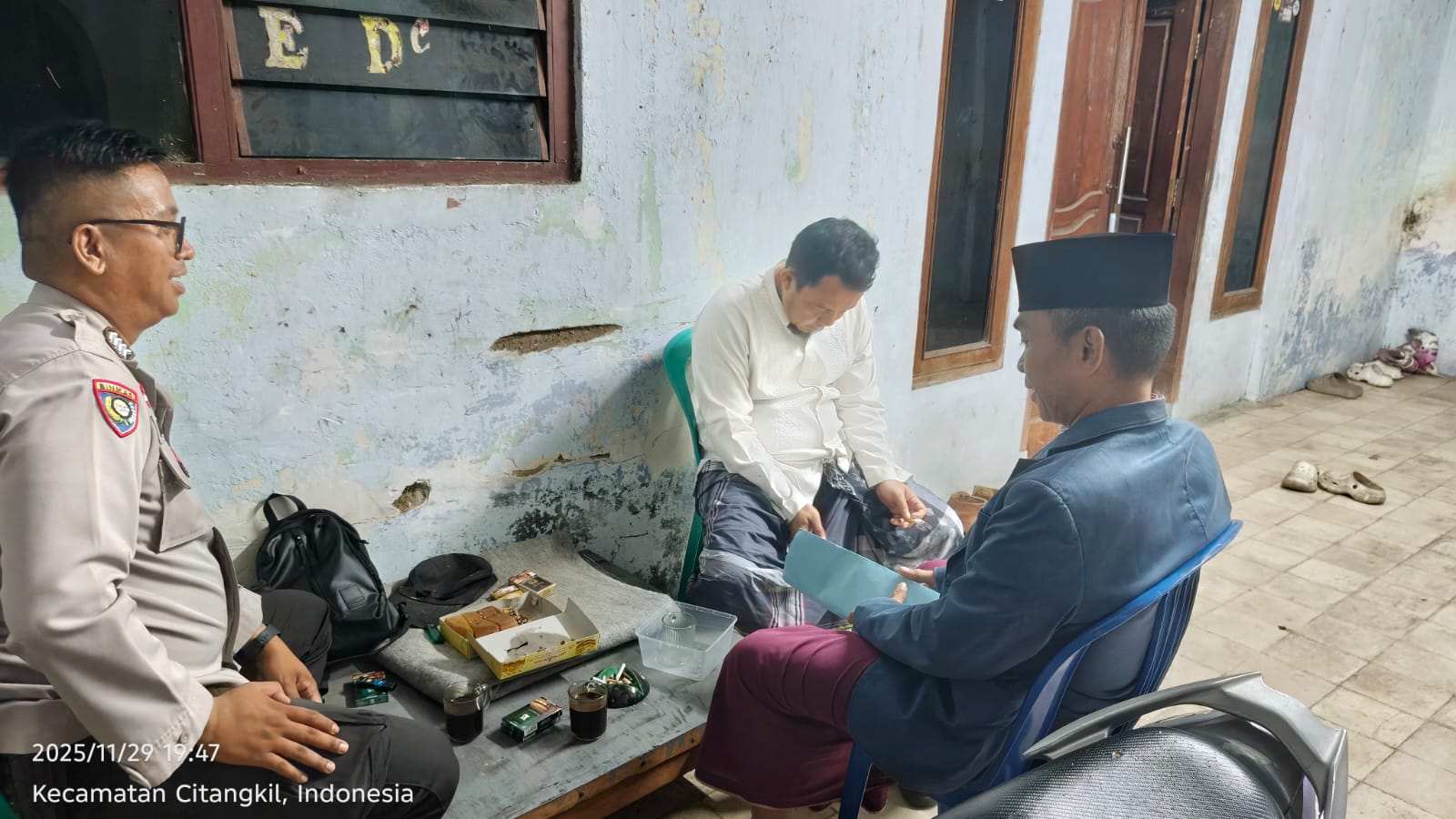 Cilegon - Upaya mengantisipasi aksi kejahatan pada daerah binaan dan memberikan rasa aman dan nyaman kepada warga binaan, Bhabinkamtibmas Polsek Ciwandan Polres Cilegon Polda Banten sambangi warga pada malam hari, Sabtu (29/11/2025).