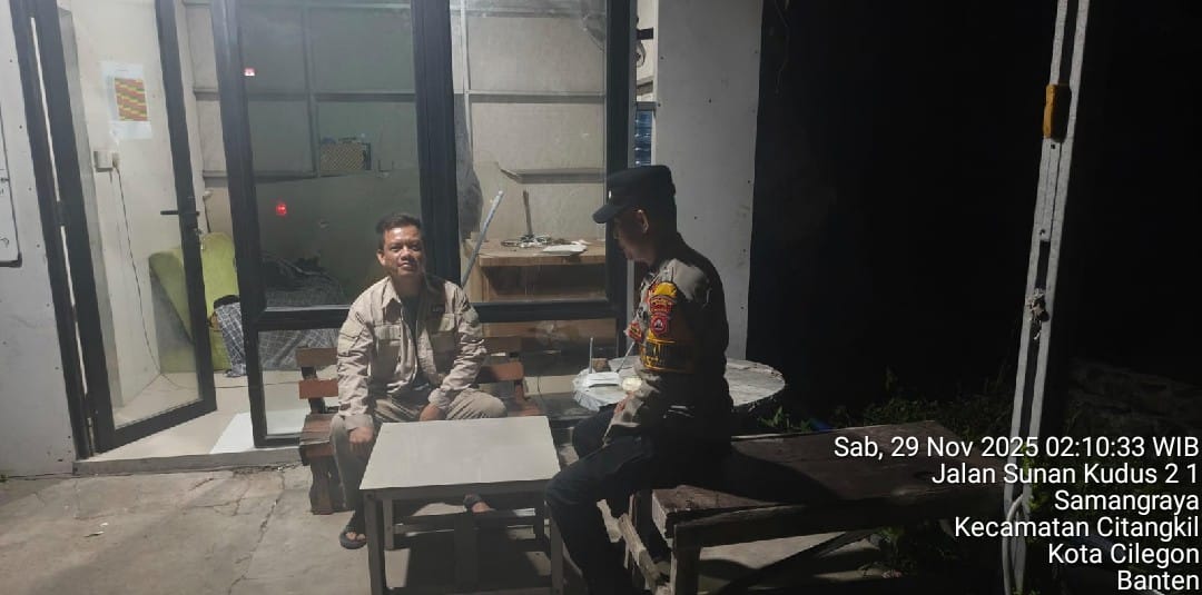 Cilegon - Upaya mengantisipasi aksi kejahatan pada daerah binaan dan memberikan rasa aman dan nyaman kepada warga binaan, Bhabinkamtibmas Polsek Ciwandan Polres Cilegon Polda Banten sambangi warga pada malam hari, Sabtu (29/11/2025).