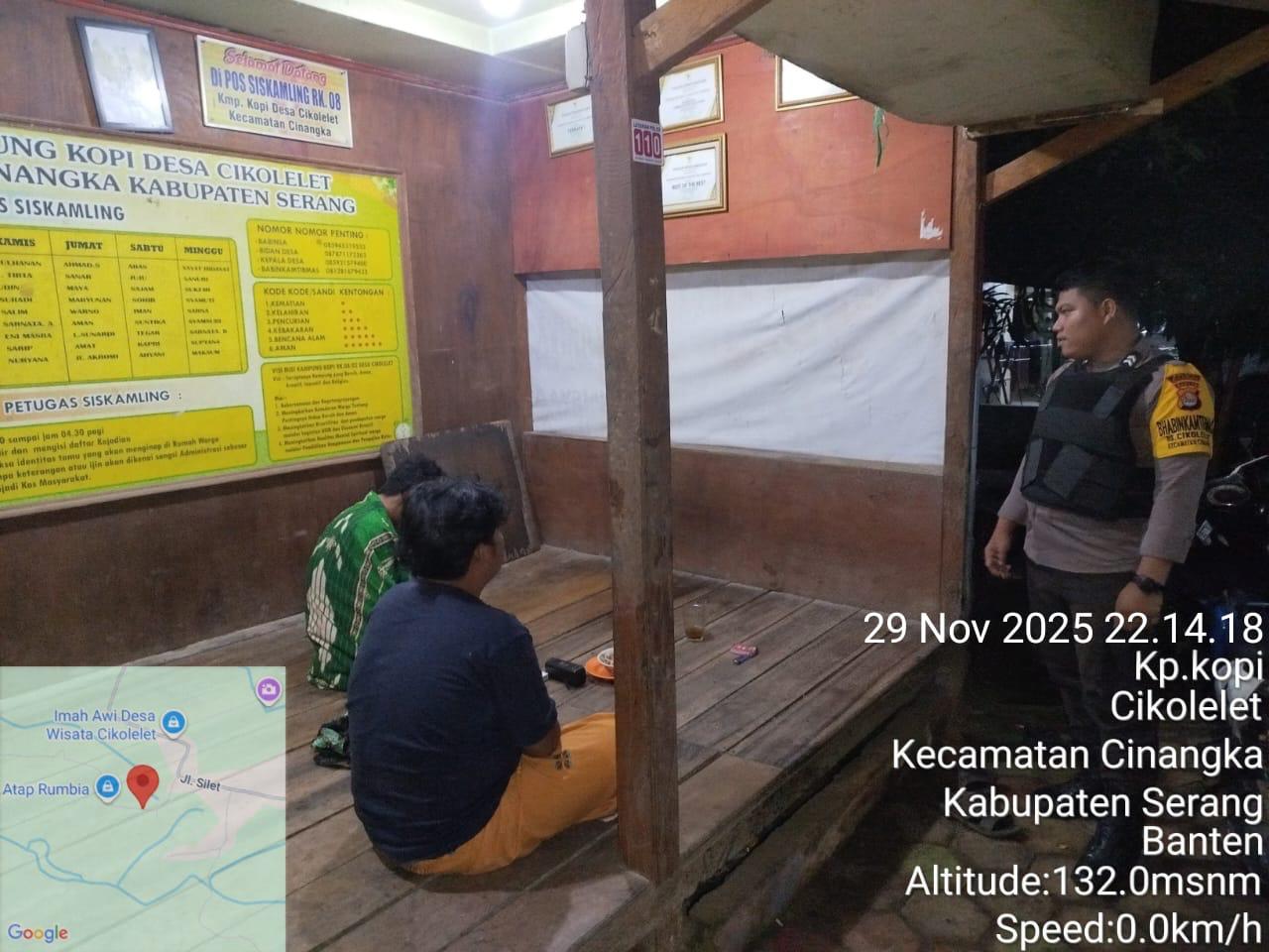 *Polres Cilegon* || Personil Bhabinkamtibmas Polsek Cinangka melaksanakan Program Komandan Wish Kapolda Banten RONDA SATKAMLING menyampaikan komunikasi dengan Petugas Siskamling agar berperan aktif dalam menciptakan Harkamtibmas yang aman dan Kondusif, Minggu (30/11/2025).