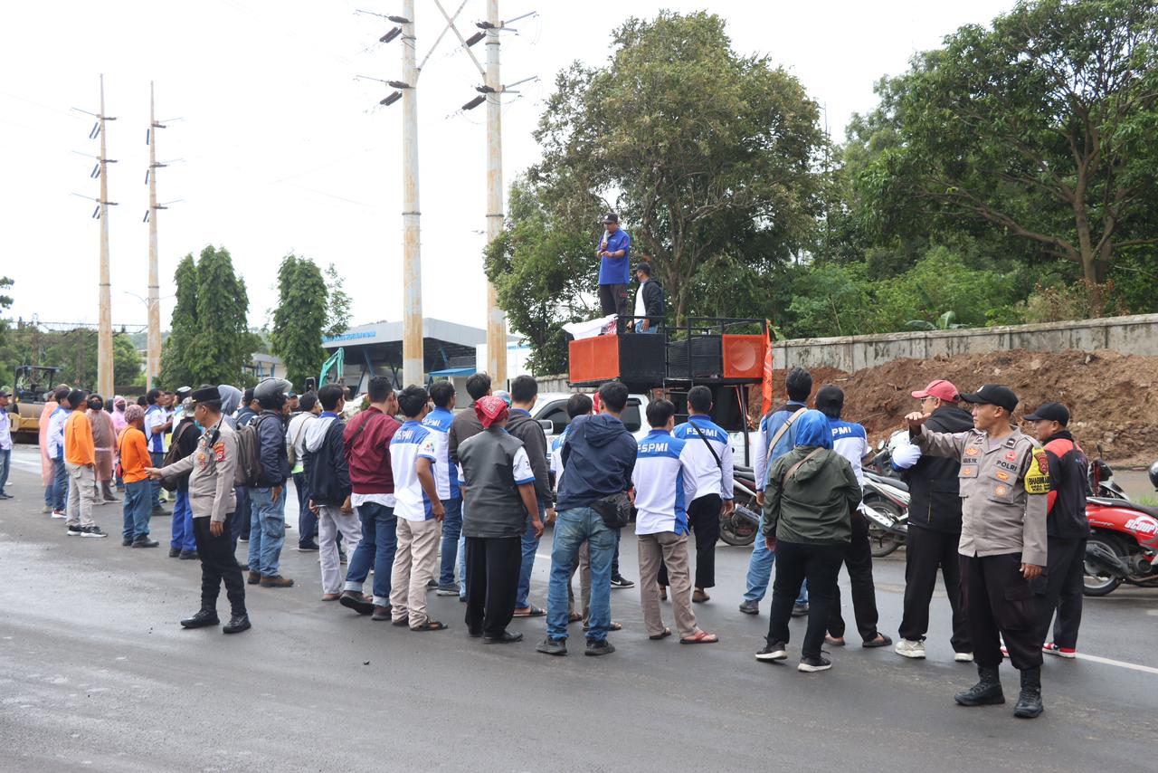Cilegon – Polres Cilegon Polda Banten melaksanakan pengamanan kegiatan aksi unjuk rasa yang digelar Federasi Serikat Pekerja Metal Indonesia (FSPMI) Kota Cilegon di depan gerbang Wisma KS, Kantor Pusat PT. Krakatau Jasa Logistik (KJL), Kawasan Industri Krakatau Engineering, Kecamatan Purwakarta, Kota Cilegon, Kamis (18/12/2025).