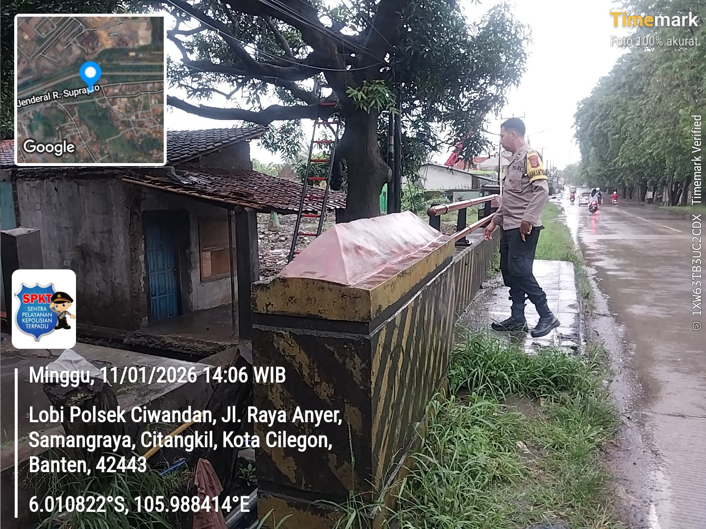 Cilegon - Dalam rangka antisipasi bencana alam personil Polsek ciwandan mengecek debit air di beberapa titik aliran sungai salah satunya yaitu kalimuk RT 005 RW 006 Kelurahan samang Raya Kecamatan citangkil Kota Cilegon, Minggu (11/01/2026).
