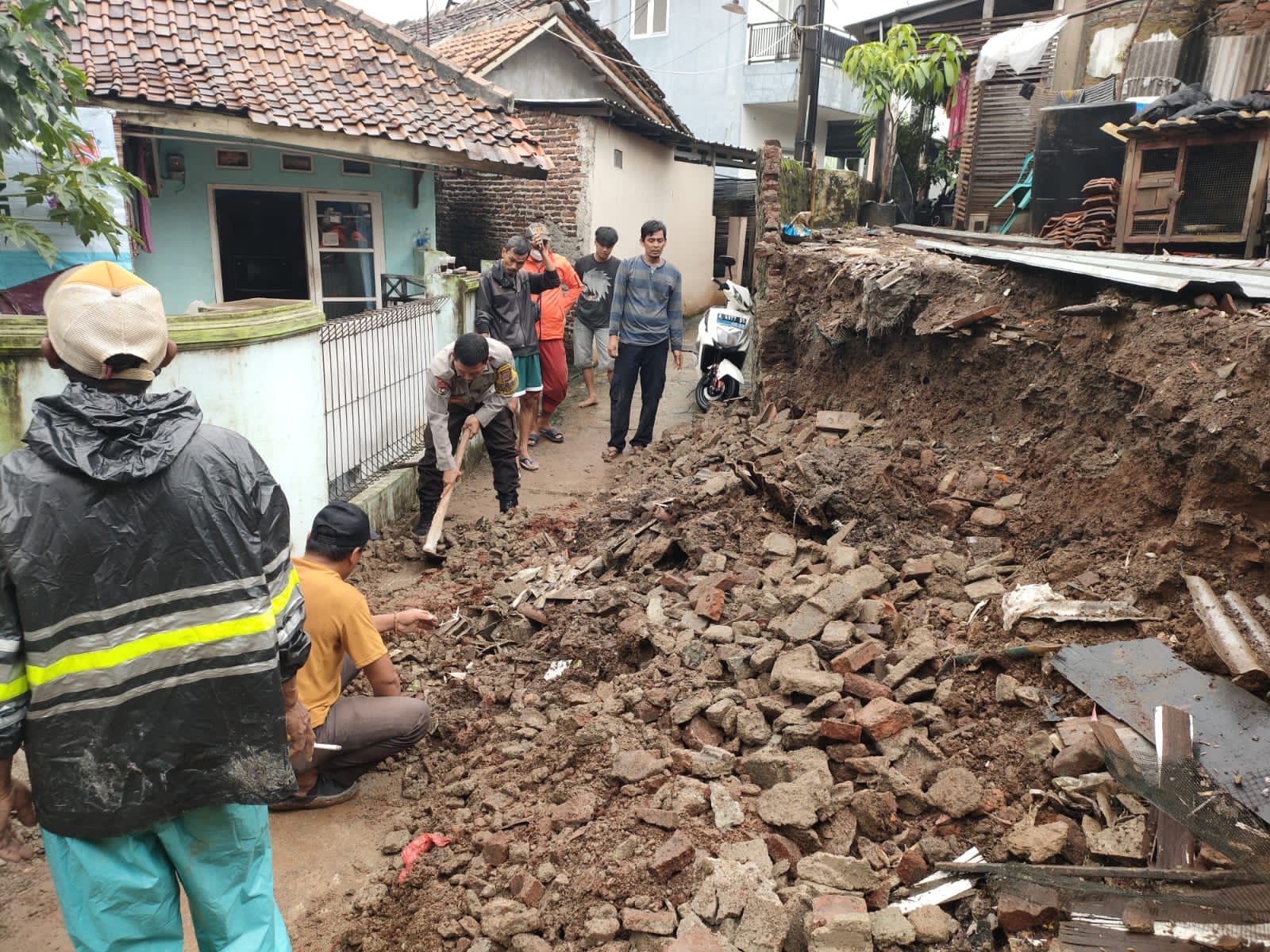 Bhabinkamtibmas Rt.02/08 Kelurahan Kotabumi, Bripka Agustoni dari Polsek Purwakarta Polres Cilegon, segera bergerak membantu warga yang mengalami longsor pada tanah sekitar rumah di Lingkungan Penyairan Atas